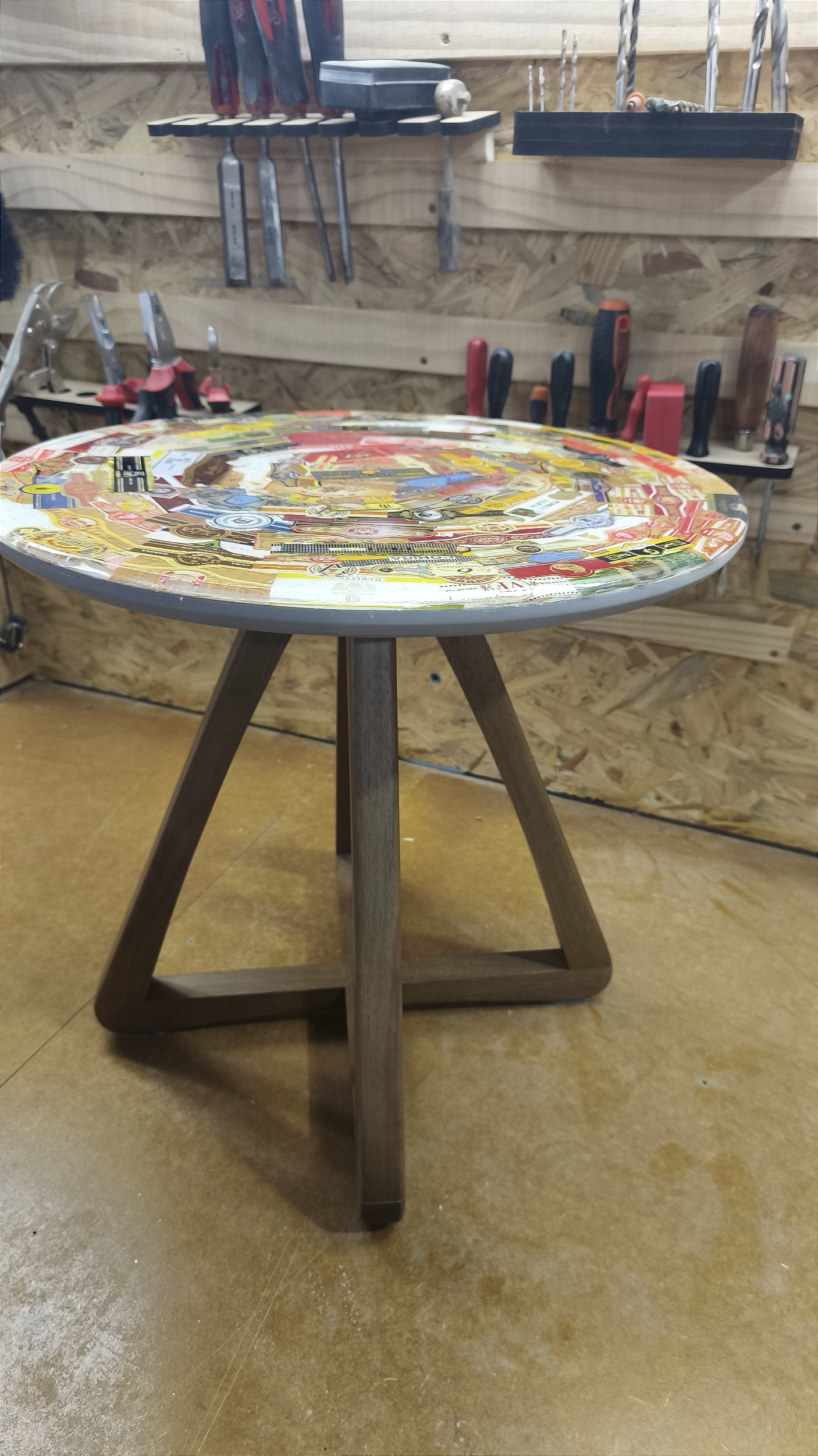 As anilhas são cuidadosamente aplicadas e protegidas, criando um tampo marcante, elegante e cheio de personalidade — perfeito para lounges, adegas, salas de estar e espaços de apreciação.
